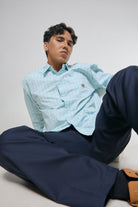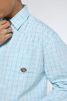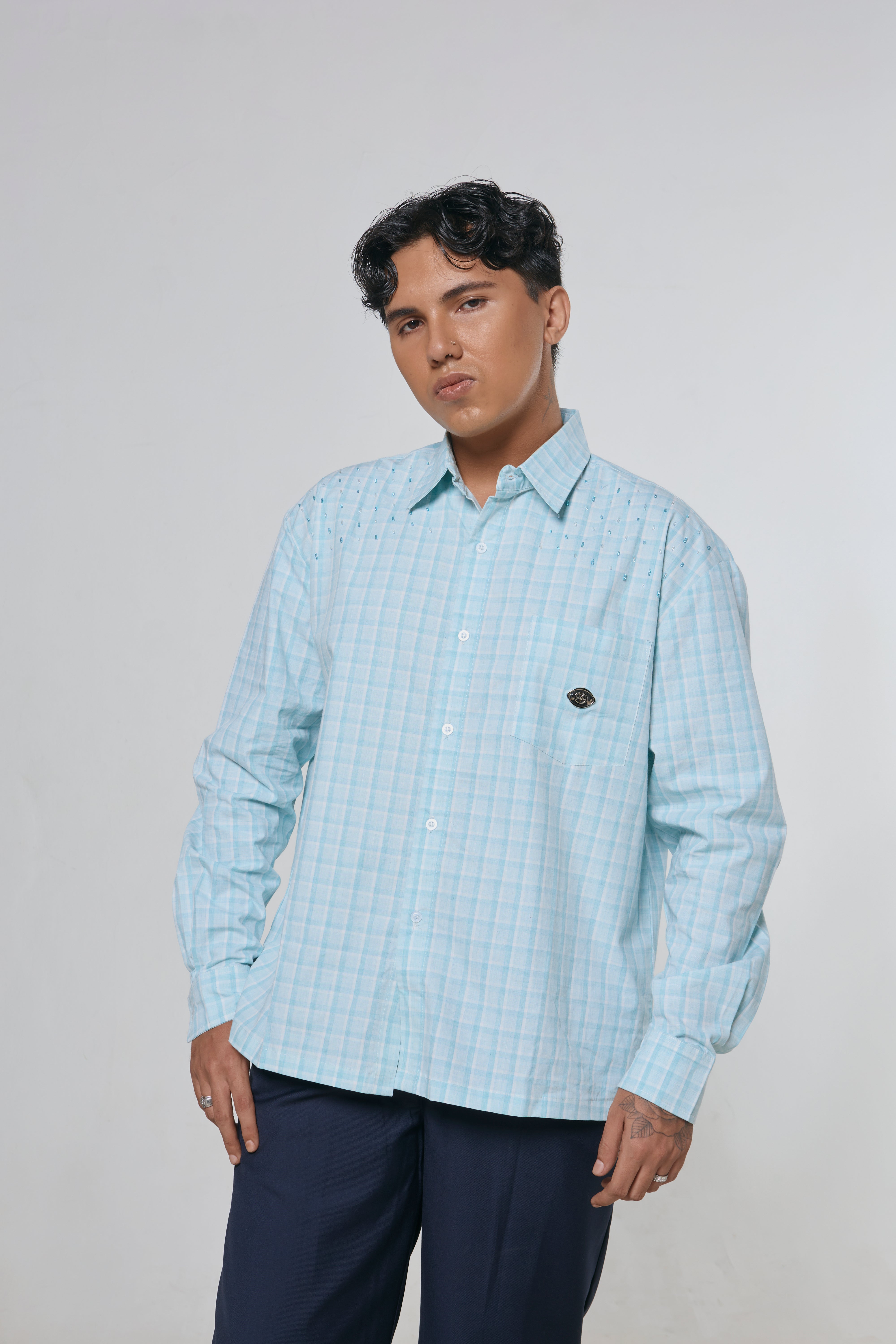 Button-up shirt made from cotton in plaid pattern and chic beads, manually made for each pieces. The fitting is an oversized fit and hip-length silhouette. An understated and carefully crafted pieces.