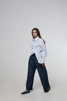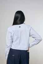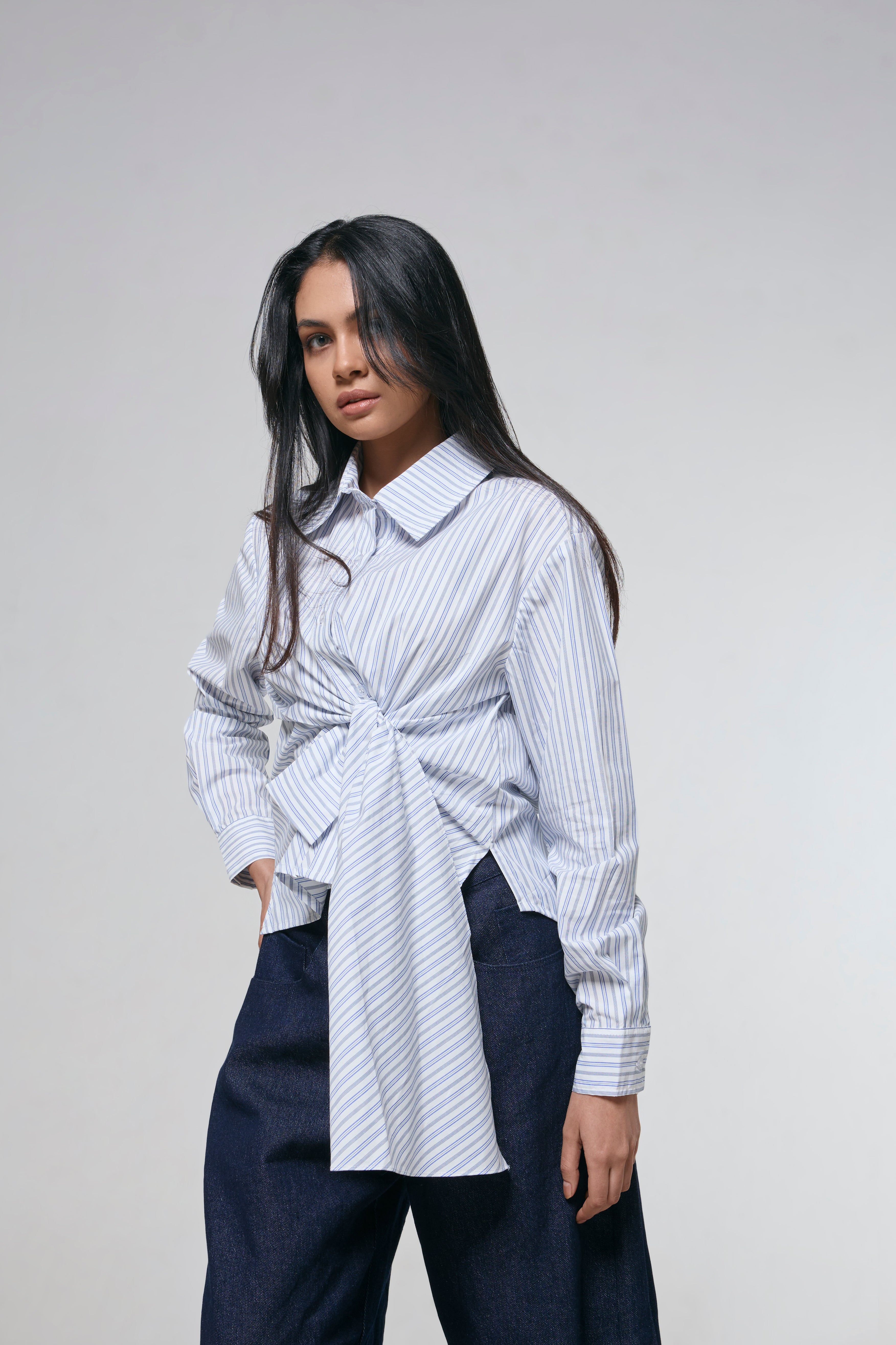 The Shirt is made with distinction of wide knot that can be worn tied or untied, a white navy Stripes pattern. Created for a relaxed fit and hip length. Suits to daily lifestyle with a bit of edge.