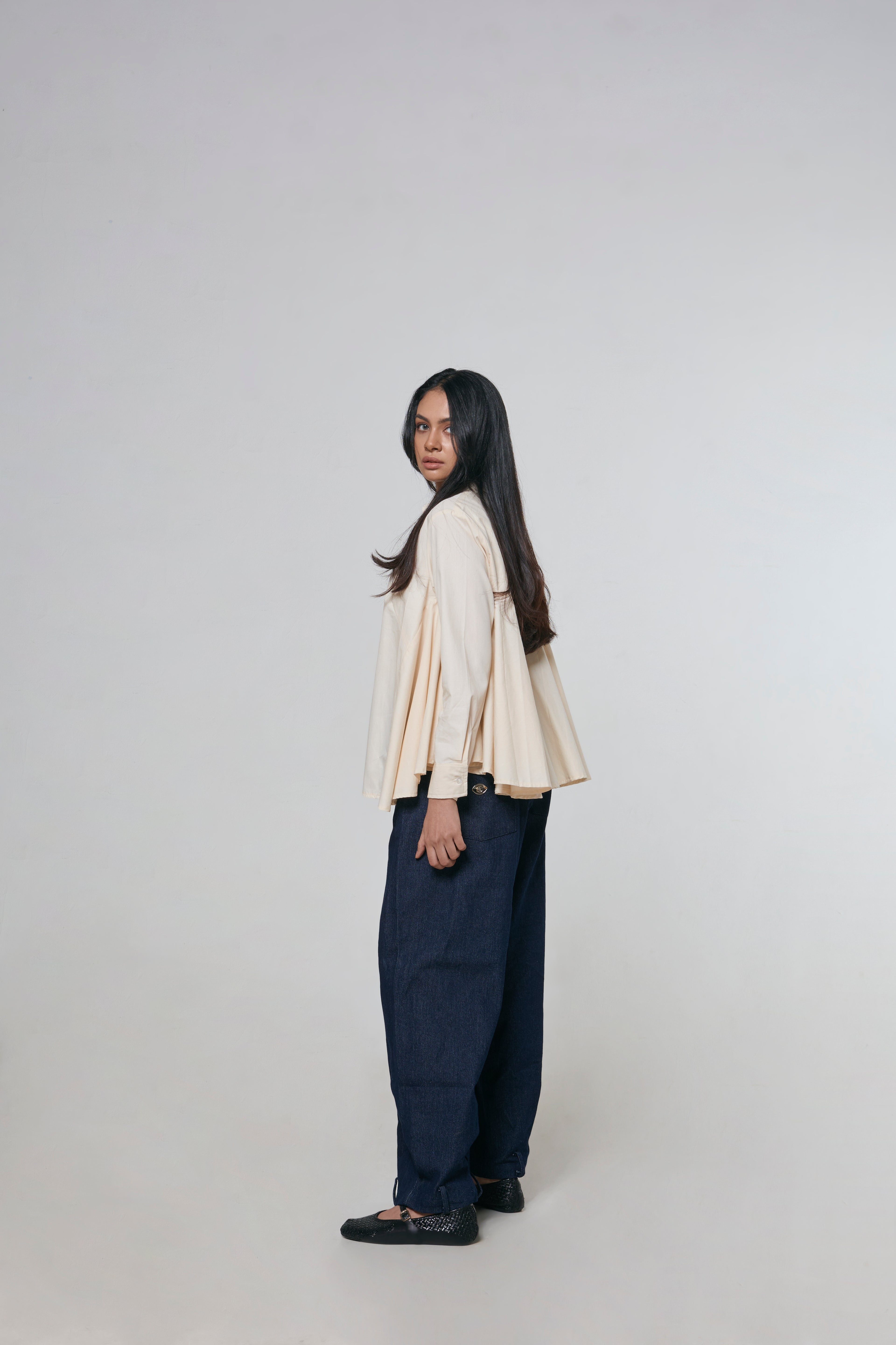 Oversized semi blouse shirt crafted from poplin cotton detailed with super flare side and back flare to add extra silhouettes. Cut to slightly dropped shoulders and cropped length.